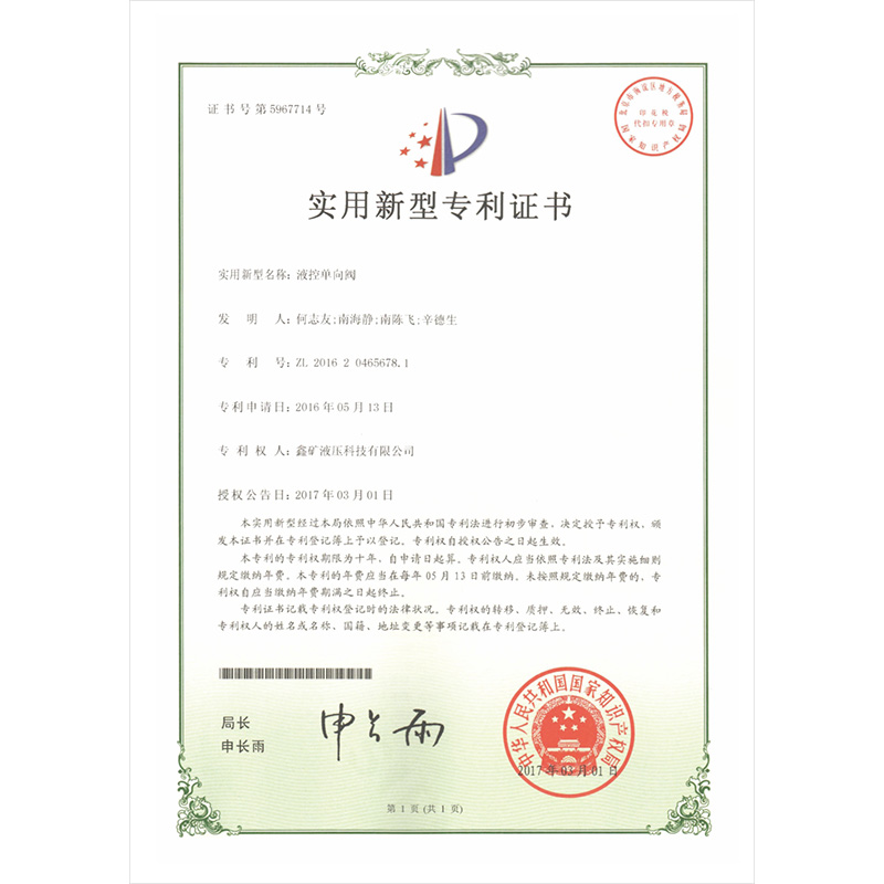 液控單向閥實用新型專利證書